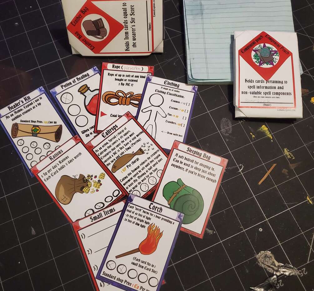 this kit also includes Blank Item cards so you can create your own cards for things that haven't been included along with a "Component Pouch" for keeping track of spell slots and storing spell cards for those who have them